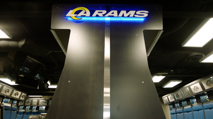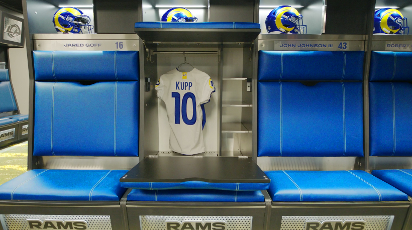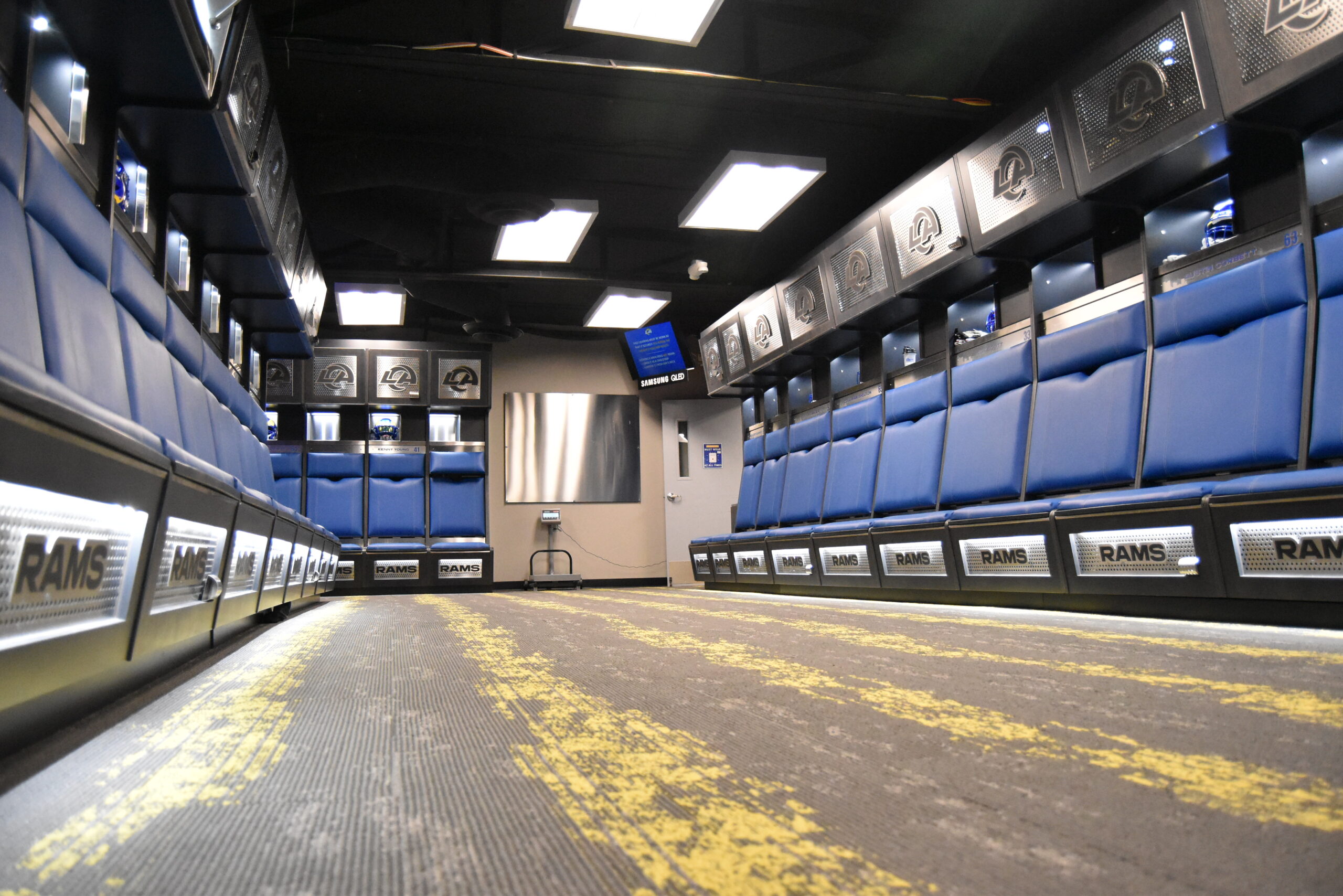 Upon entering the Los Angeles Rams’ locker room, the first thing that jumps out is that there are no orthodox “lockers”. Instead, each player has a hole in the wall that acts almost like their own personal closet. Each “locker” is blocked off by dividers that are similar in size and style to flags. Each player’s name has been typed out on a sign above their locker in big letters. The middle of the room is completely open. Each locker is built into the wall, setting up a perimeter of lockers that circle the room.