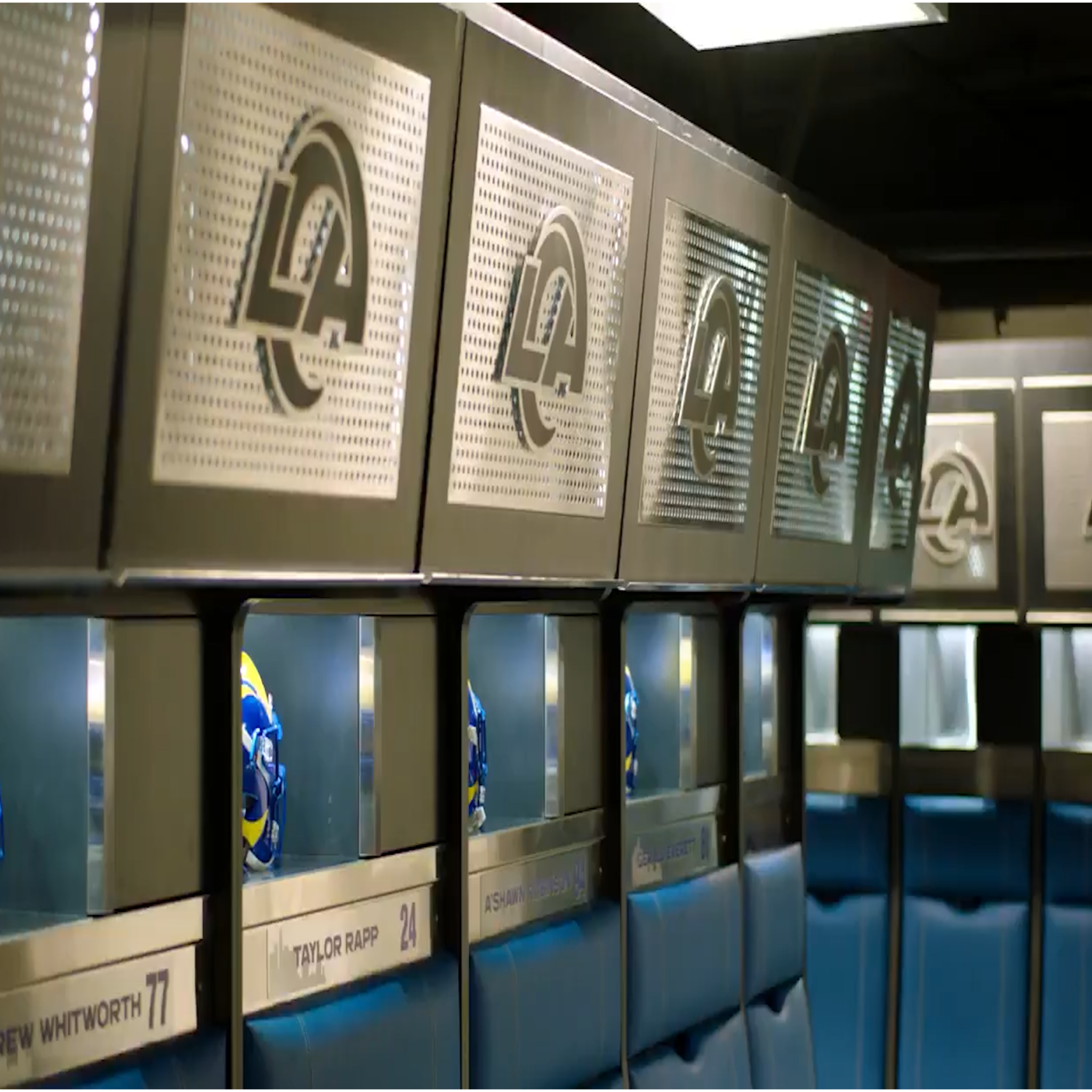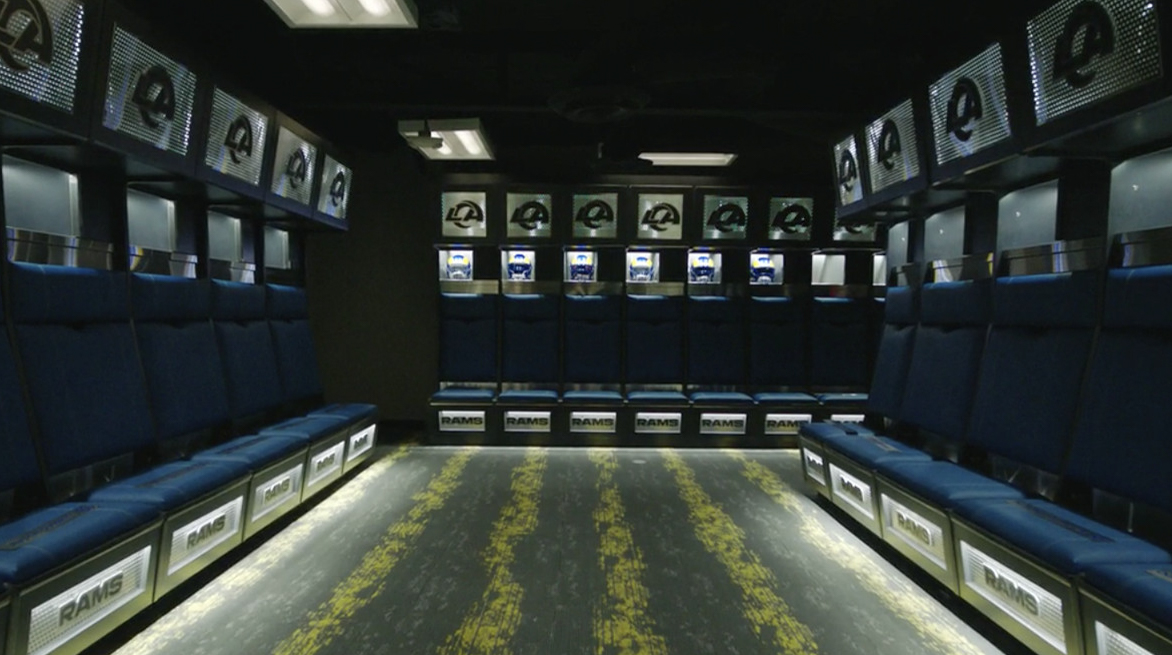 The practice facility for the Rams hasn’t been touched since the team made the move from St. Louis back in 2016. Recently, the entire locker room was gutted and completely revamped, with upgrades being made across the board. If it could be improved, it looks like the Rams took the time to make it happen. New lockers, seating, lightning, flooring, the whole dang thing is brand-spanking new. Although the team is planning to begin the new era of Rams football with a new stadium, the team’s headquarters are remaining in Thousand Oaks at Cal Lutheran. A few exquisite details include the chrome detailing around the edges, including the name plates.