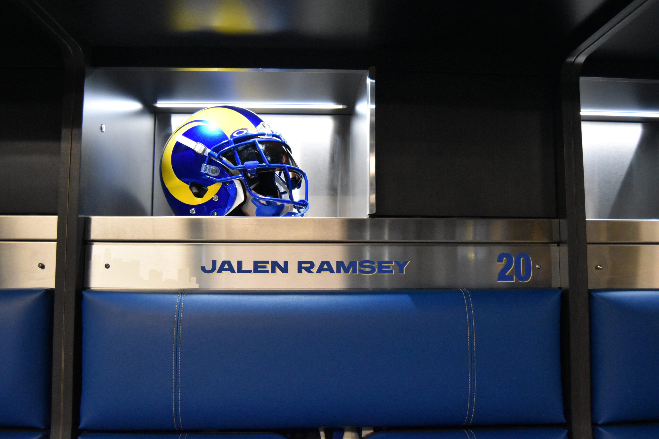 The practice facility for the Rams hasn’t been touched since the team made the move from St. Louis back in 2016. Recently, the entire locker room was gutted and completely revamped, with upgrades being made across the board. If it could be improved, it looks like the Rams took the time to make it happen. New lockers, seating, lightning, flooring, the whole dang thing is brand-spanking new. Although the team is planning to begin the new era of Rams football with a new stadium, the team’s headquarters are remaining in Thousand Oaks at Cal Lutheran. A few exquisite details include the chrome detailing around the edges, including the name plates.
