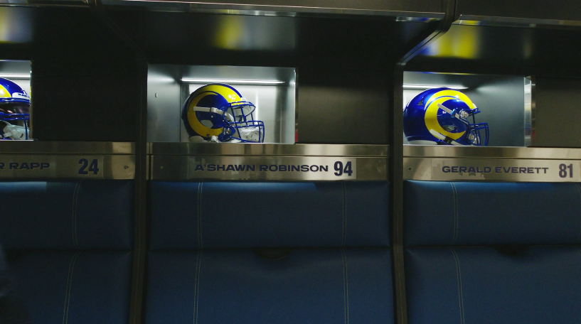 Upon entering the Los Angeles Rams’ locker room, the first thing that jumps out is that there are no orthodox “lockers”. Instead, each player has a hole in the wall that acts almost like their own personal closet. Each “locker” is blocked off by dividers that are similar in size and style to flags. Each player’s name has been typed out on a sign above their locker in big letters. The middle of the room is completely open. Each locker is built into the wall, setting up a perimeter of lockers that circle the room.
